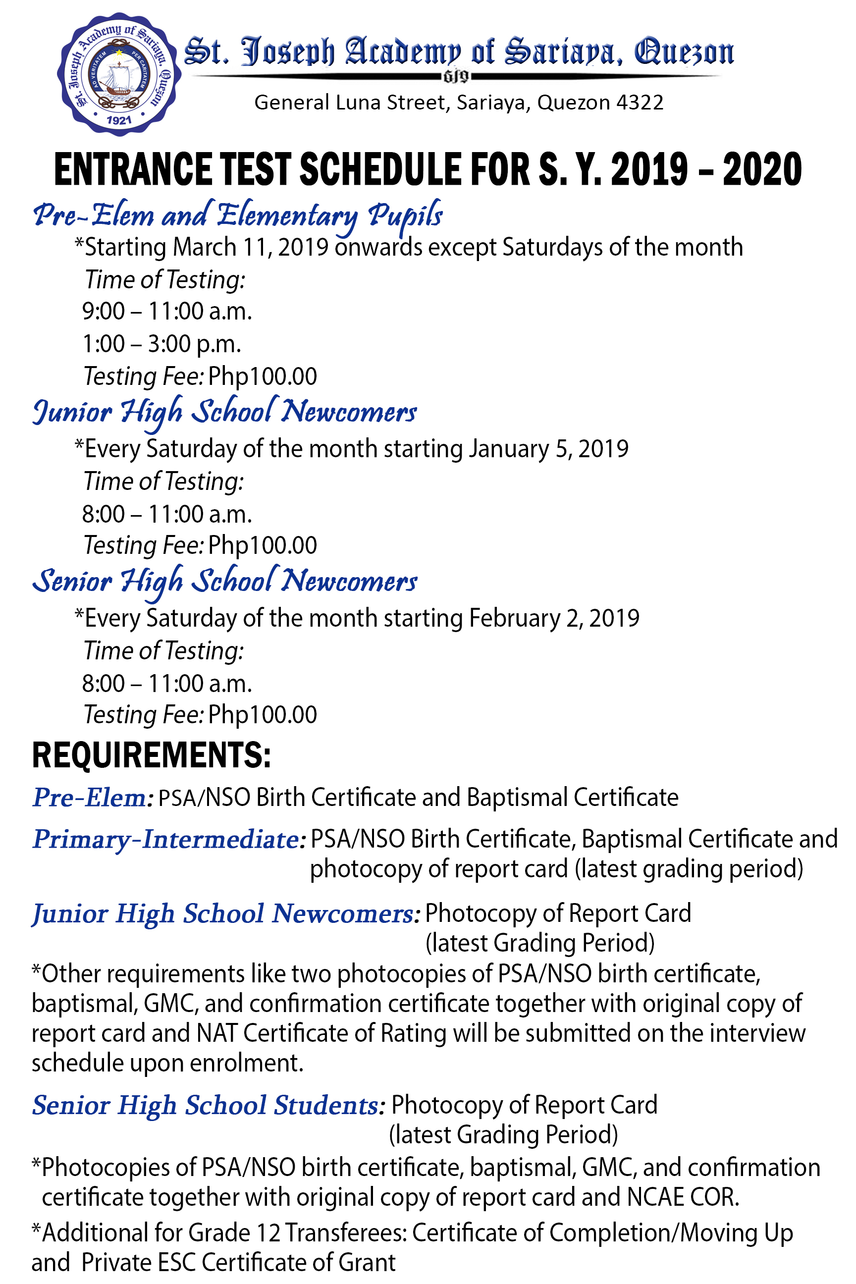 Entrance Test Schedule for S. Y. 2020-2021